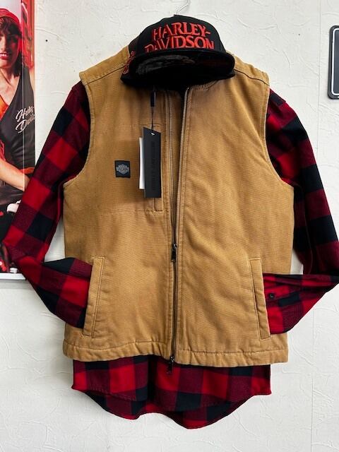 5枚目画像:ハーレー純正ヘリテイジ・メカニックベスト#97441-25VMと、純正ネルシャツ#96801-25VMとのコーデ画像。