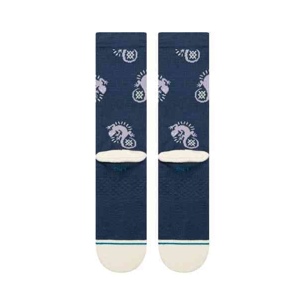 深みのあるネイビーに淡いトーンの総柄モチーフを散りばめたクルーソックス。