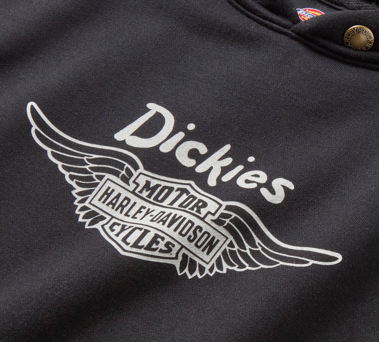 フロントと袖にあしらわれたカスタムグラフィックには、Dickiesの象徴的なホースシューと、ハーレーダビッドソンの1930年代シルバーウィングロゴがあしらわれています。